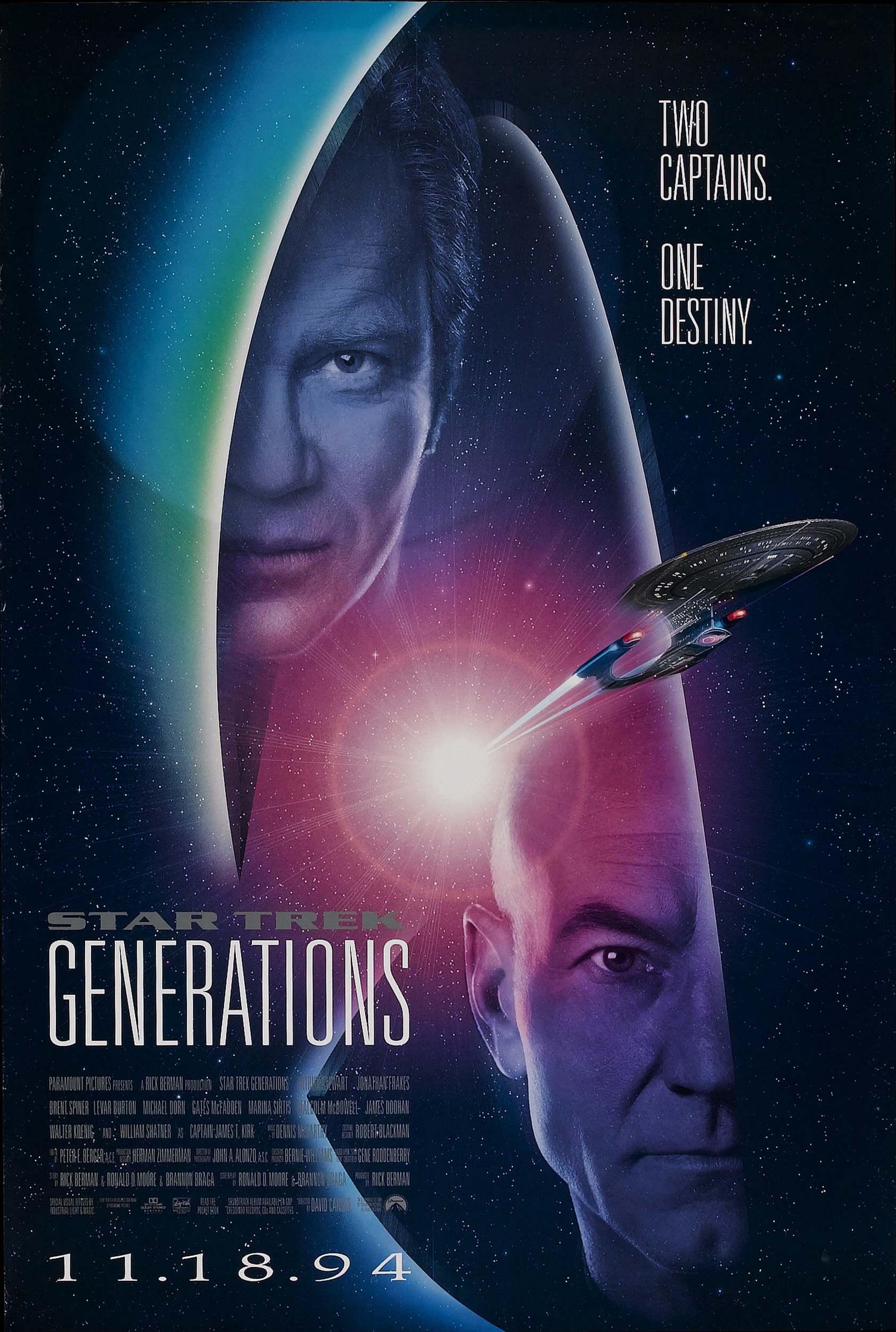 Reparto: William Shatner (Capitán James Tiberius Kirk), James Doohan (Montgomery Scott “Scotty”), Walter Koening (Pavel Chekov), Patrick Stewart (Capitán Jean-Luc Picard), Jonathan Frakes (Comandante William T. Riker), LeVar Burton (Teniente comandante Geordi La Forge), Michael Dorn (Teniente Worf), Marina Sirtis (Consejera Deanna Troi), Brent Spiner (Teniente comandante Data), Majel Barret (computadora del Enterprise), Gates McFadden (Doctora Beverly Crusher), Malcom McDowell (Soran), Whoopi Goldberg -no acreditada- (Guinan)