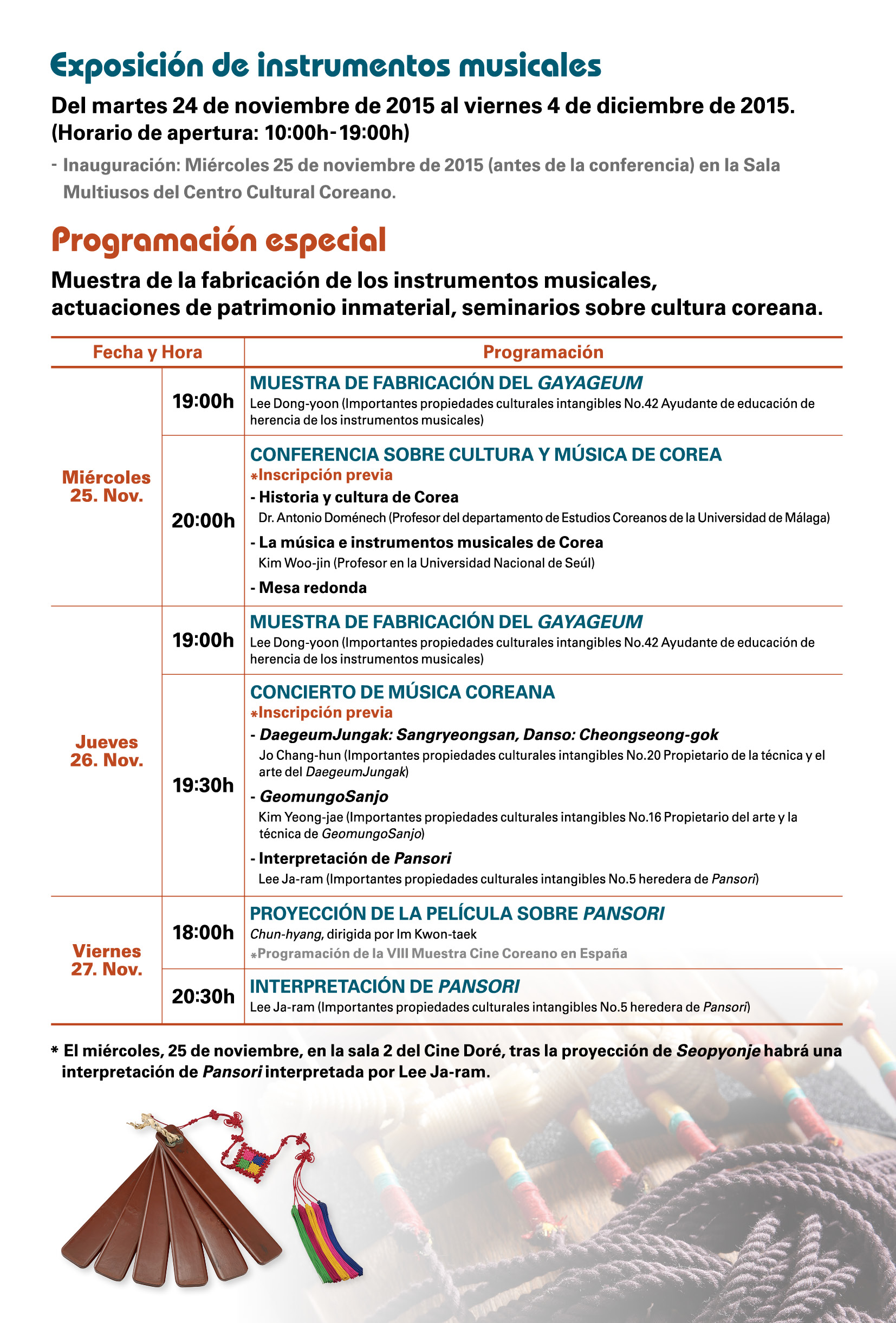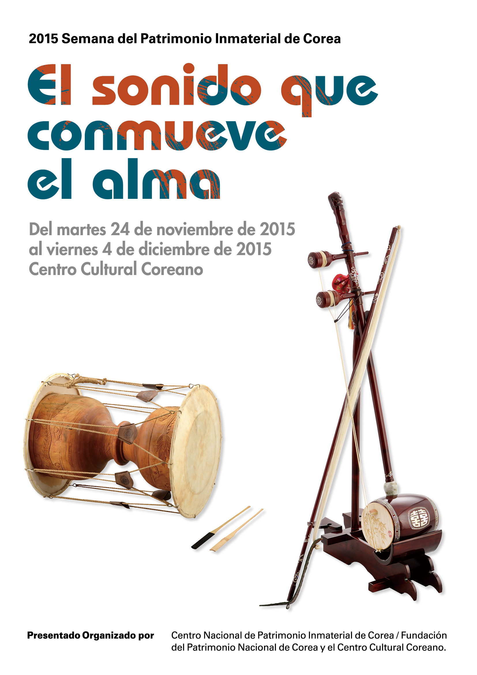 El Centro Cultural Coreano perteneciente a la Embajada de la República de Corea presenta, en colaboración con el Centro Nacional de Patrimonio Inmaterial de Corea y la Fundación de Patrimonio Nacional, La Semana del Patrimonio Inmaterial de Corea del 24 al 27 de noviembre. La música coreana será la protagonista en esta semana cultural que además incluye: Una exposición de instrumentos tradicionales de música que muestra la fabricación del Gayageum (tipo de cítara de 12 cuerdas), y una programación especial con una conferencia sobre cultura y música tradicional de Corea, un concierto de los Maestros de música tradicional, y una proyección de la película sobre Pansori, Chun-hyang (canto narrativo tradicional de Corea) el 27 de noviembre, que forma parte de las proyecciones de la 8ª Muestra de Cine Coreano. La exposición de instrumentos tradicionales coreanos comenzará el 24 de noviembre y permanecerá abierta al público en la Galería Hanul del Centro hasta el viernes 4 de diciembre. Los instrumentos musicales de percusión, cuerda y viento que se exhibirán son: Teukjong, Janggo, Buk, Jing, Kkwaenggwari, Ulla, Jabara, Bak, Gayaguem, Geomungo, Ajaeng, Haeguem, So, Daeguem y Piri.