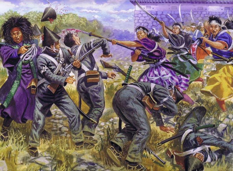 Para cuando estallaron varias revueltas en las que muchos iban a favor del Shogunato y otros reclamaban el fin de la política de puertas cerradas que prohibía la entrada de occidentales en el país, en la Guerra Boshin la guerrera Nakano Takeko y su escuadrón de mujeres armadas con naginata entraron en acción luchando codo con codo junto al ejército de Aizu para defender el castillo de Wakamatsu en 1868. En esta batalla –la Batalla de Aizu– tres mil samuráis del clan combatieron hasta la muerte contra la armada imperial, que contaba con unos veinte mil efectivos equipados con armas occidentales, una diferencia abismal entre ambos bandos difícil de salvar. Y fue en esa batalla donde Nakano Takeko combatió heroicamente junto a sus compañeras dando muerte a muchos enemigos con su naginata, hasta caer fulminada a causa de un disparo.