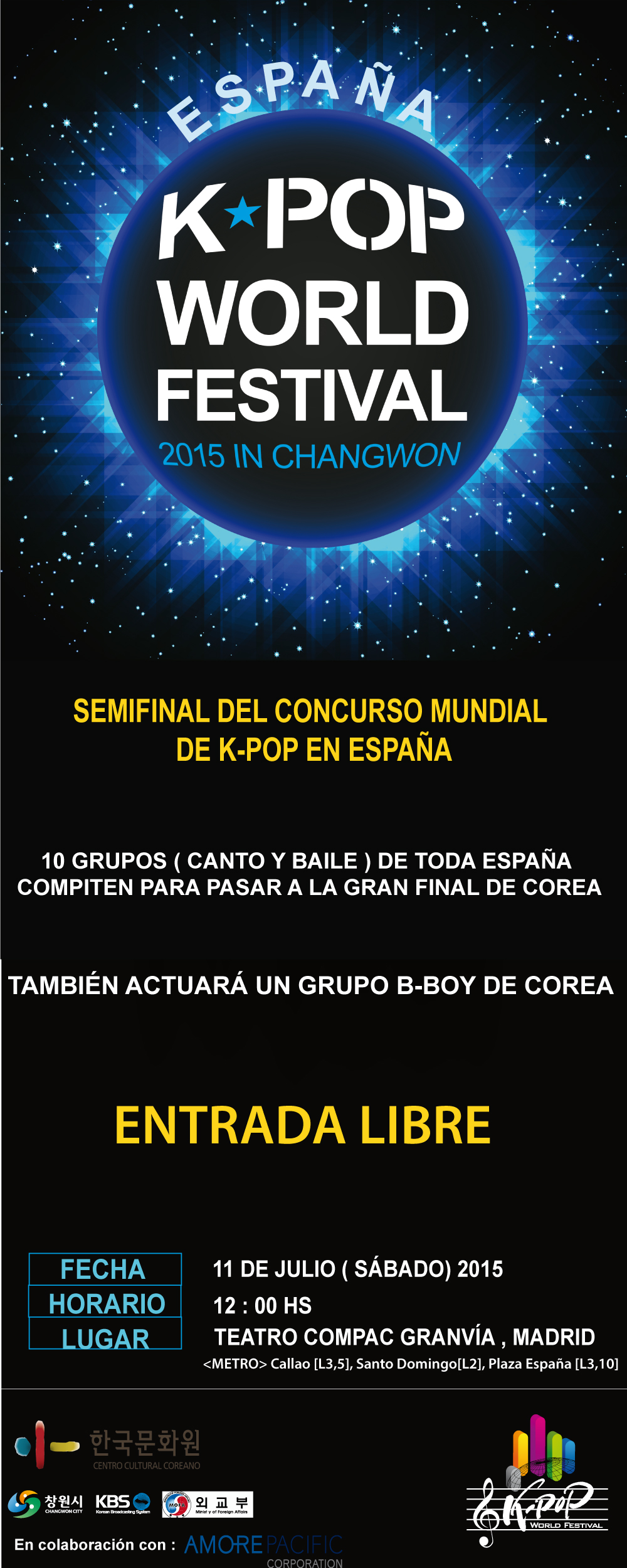 El Centro Cultural Coreano, perteneciente a la Embajada de la República de Corea en colaboración con el Ministerio de Cultura, Deporte y Turismo de Corea, celebra el próximo sábado 11 de julio a las 12h la IV Edición de la Semifinal del Concurso K-POP World Festival 2015, con el objetivo de promover y difundir la música pop coreana en el mundo. El concurso tendrá lugar en el Teatro Compac Gran Vía de Madrid (Calle Gran Vía, 66).