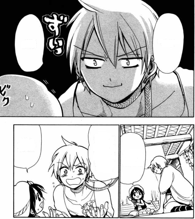Otro punto a favor es su humor. ¿Qué sería de un manga sin esos toques de humor que amenizan la historia? Pues Magi –al menos en este tomo- tiene bastantes escenas que te hacen reír, y el dibujo –o más bien las caras de los personajes y las escenas rocambolescas- contribuyen a ello.