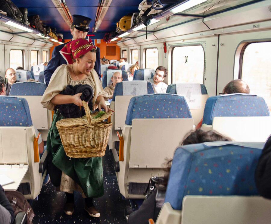 • Viaje de ida y vuelta en tren regular Madrid-Soria-Madrid con teatralización durante el viaje de ida a Soria. Degustación de productos “Saborea Soria” a la llegada a Soria.