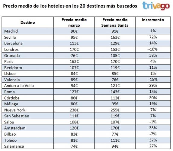 El comparador de precios de hoteles www.trivago.es publica el precio medio de los hoteles de los 20 destinos más buscados por los españoles para reservar hotel en Semana Santa. El mayor incremento de precios se produce en Sevilla, donde las tarifas se elevan en un 72%, pasando de costar una noche 95 euros de media durante el mes de marzo a 163 euros por noche durante la Semana Santa.